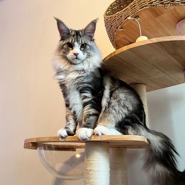 Andrew is a treasure for sure! His personality is like no other, he is dossal and easy going as all can be, but at the same time curious and playful. He is not as cuddly as some of our other Maine Coons, but he loves company and to lay with you for hours on end.