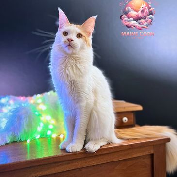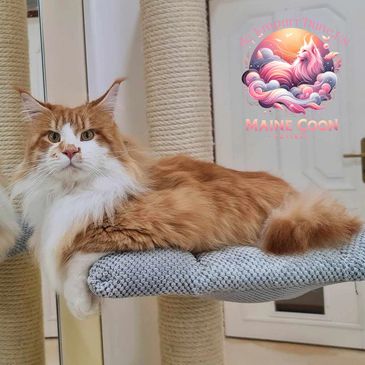 Meet our regal fluffball, Ollie the 14th, a majestic Maine Coon with a coat as vibrant as his personality! Adorned in red and white, his floofy pantaloons add a touch of royal charm to his already regal presence.